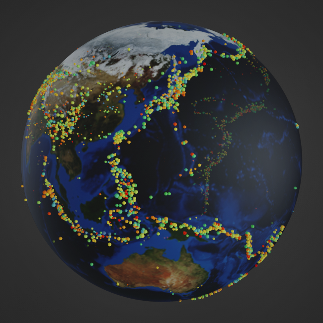 In the Geometry Nodes group, I can use spherical to carthesian transformation to construct position vectors for each vertex in the mesh, based on their Latitude and Longitude attributes. I can then instance an icosphere primitive to each of these points, and set its scale based on another attribute: the earthquake magnitude.